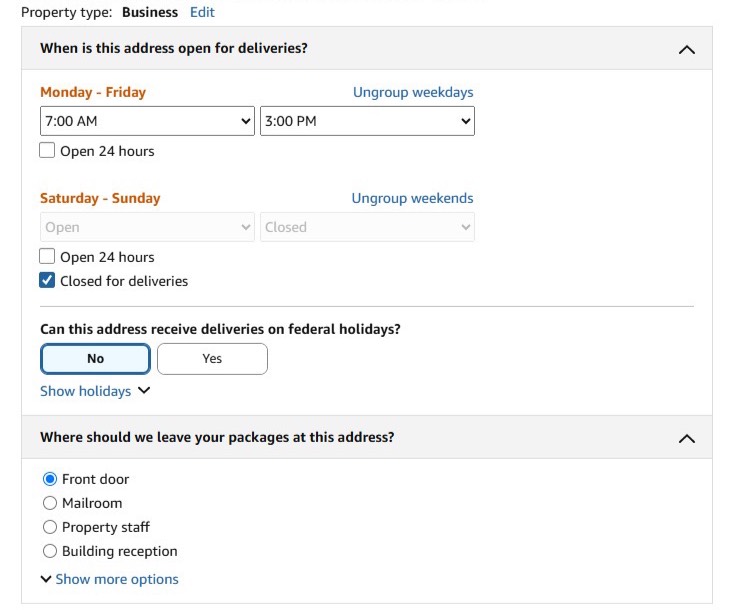 另外, 國定假日選項 " Can this address receive deliveries on federal holidays? " 這選項麻煩勾選 "No"